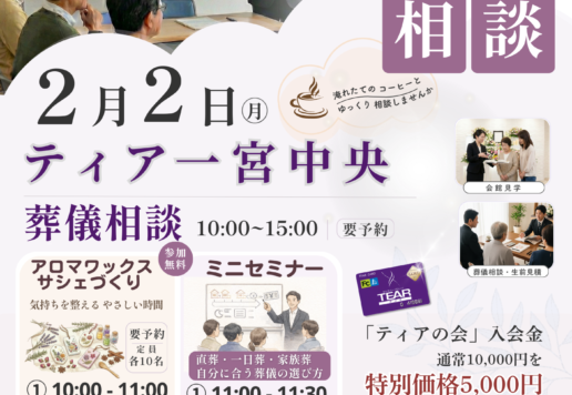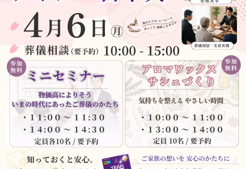 「ありがとう。」参列されたすべての方々がその最後の想いをしっかりと伝えられるご葬儀とさせていただくことがティアの使命です。そのためには、ご遺族のお話をていねいにお聞きすることからはじめます。そして、生前の故人様に想いをはせ、ご遺族の望まれるかたち、故人様の最後にふさわしいご葬儀となるよう全力で取り組みます。