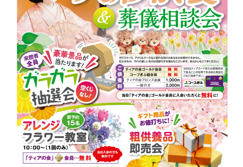 「ティアの会」入会キャンペーンのお知らせです。 新店舗オープン予定にあわせて、ただいま期間限定の入会特典をご用意しております。 「もしもの前に、話してみる」。 葬儀に関するご相談は、事前でもお気軽にご利用いただけます。...