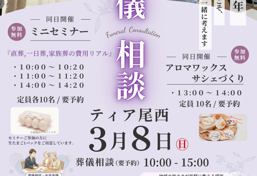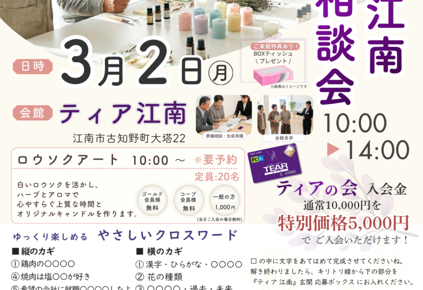 「ティア江南」にて、葬儀相談会を開催いたします。 「もしもの前に、話してみる」ことから始めてみませんか。 費用や段取り、葬儀形式など、ご本人・ご家族の状況に合わせて丁寧にご案内いたします。 当日は、ロウソクアートやクロ...